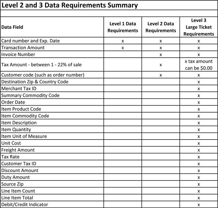 The information below summarizes the available discounts and potential savings to be achieved by taking advantage of Level III transaction data rates.